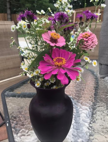 - Zinnas - These do great in pots and make such nice cut flowers. The more you cut them, the more they grow. Who needs expensive garden center flowers when you can save your own seeds and plant more zinnias. (The chamomile in this picture came from the overgrown field behind our yard.)