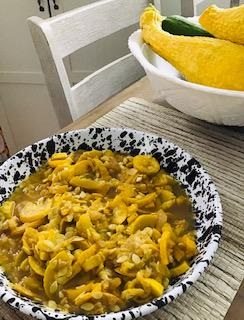 - Southern Stewed Squash & Onions - This is a huge family favorite! Of course, Doug wouldn't eat it if his life depended on it. I'll post the recipe soon. Yes, mine has seeds. I don't mind the seeds and even somewhat overgrown squash turned out fine in this dish. I make a huge batch once a week and eat on it all week w/ different main dish items. Squash is the one thing my family ate in Florida all.the.time. We rarely had canned vegetables. Mostly it was stewed squash, fried squash, fried okra, stewed tomatoes, sliced tomatoes, rice, big limas. Stuff like that.